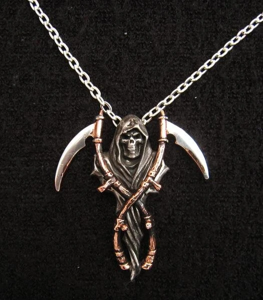 This Alchemy pendant is a harvester of sorrow and badge of fate; two-tone pewter. All pendants are cast and hand-made in fine English pewter, many have additional high quality crystals and components, hand plated or other two-tone finish and come complete with nickel-free chain or other necklace of appropriate length.