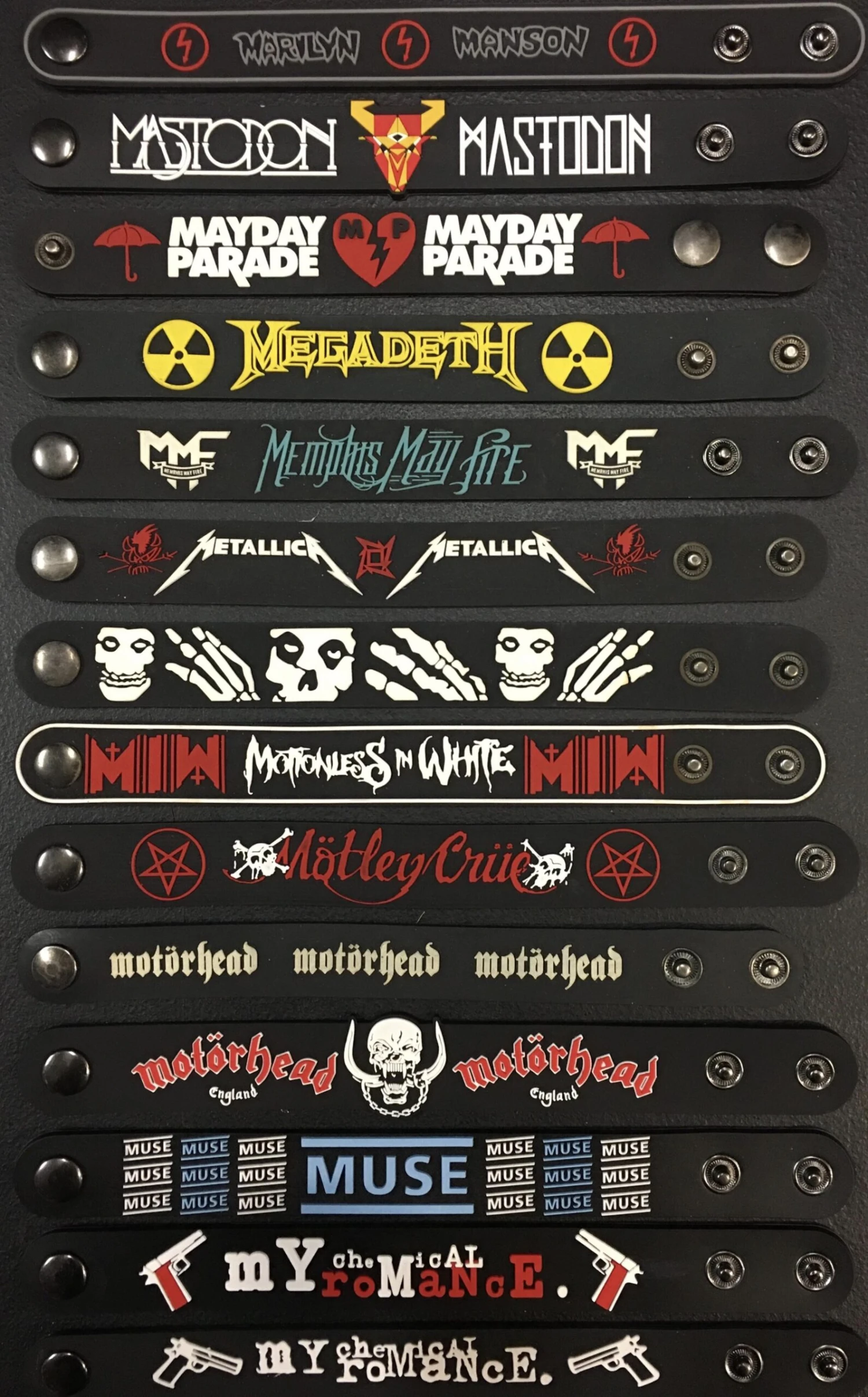 | BAND | MARILYN MANSON, MASTODON, MAYDAY PARADE, MEGADETH, MEMPHIS MAY FIR, METALLICA, MISFITS, MOTIONLESS IN WHITE, MOTLEY CRUE, MOTORHEAD 1, MOTORHEAD 2, MUSE, MY CHEMICAL ROMANCE 2 |